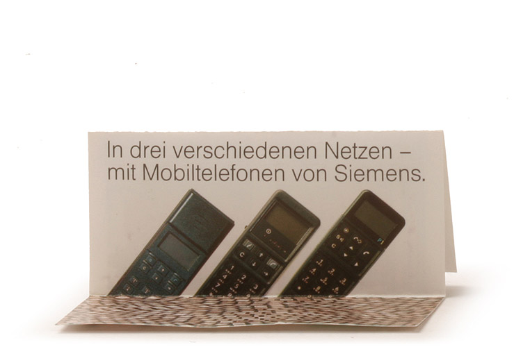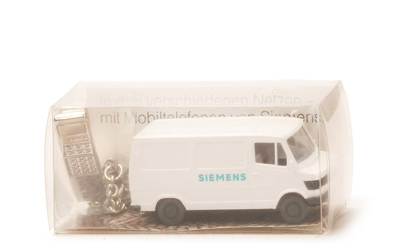 Siemens Werbemodell. Komplettzustand mit Werbeeinlage (hier mit "IAA 91"-Logo) und verchromtem Telefon als Schlüsselanhänger.