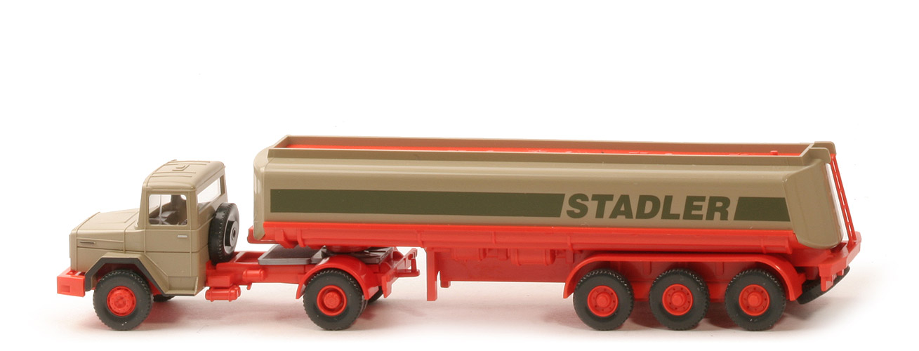Durch neugeschaffenes Zugmaschinen-Chassis möglich gewordener Tanksattelzug. Die Kabine war bei den historischen Modellen nur bei 3-Achs-Baufahrzeugen zu finden. Die Chassisfarbe (offiziell "leuchtrot") hat eine deutliche Plastik-Anmutung. Sonst sehr hübsches Modell.