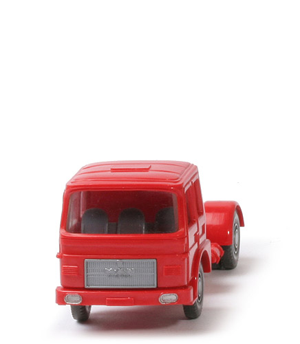 Messemuster, wie in der Bildpreisliste 1973 abgebildet. Beachtenswert sind die runden Kotflügel der Achseinheit des Aufliegers in rot. Selten auch: die Kabine in rot mit Lüftergittern. Die gab es nie in der Serie! Megararität.
