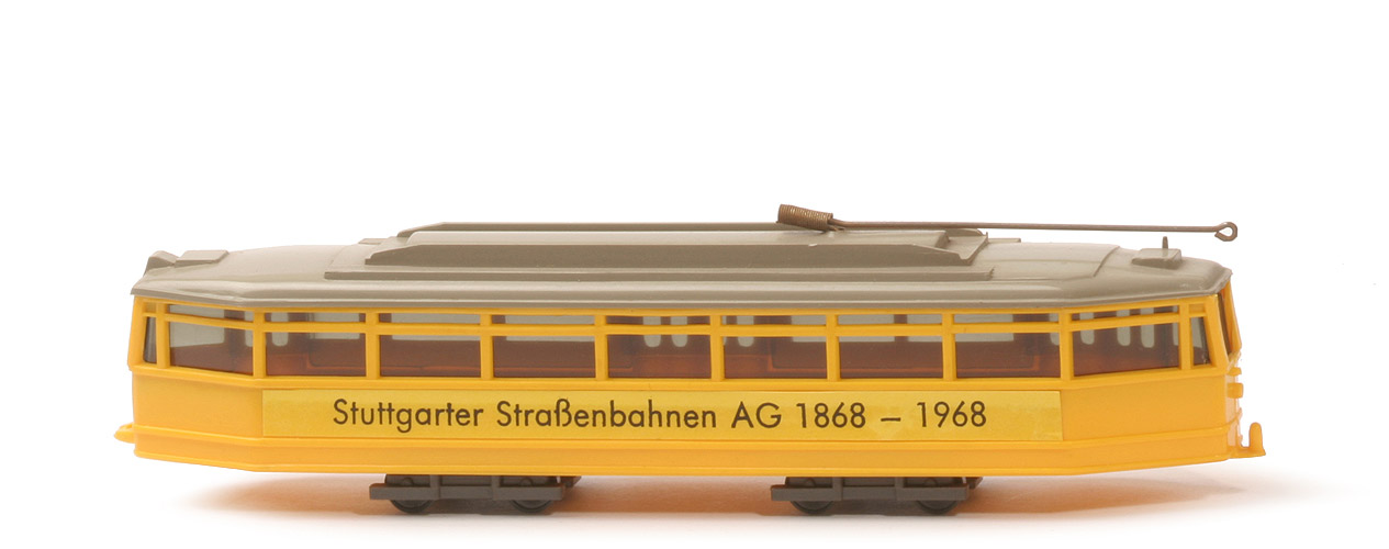 Hier gibt es auf der Fahrerseite einen Papieraufkleber Stuttgarter Straßenbahnen AG 1868 - 1968. Echt? Quelle eher dubios. |