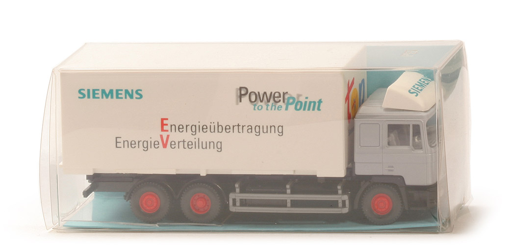 Mit diesem Wechselkoffer ist dieses Modell nicht im GK einzeln gelistet. Der Koffer ist vom Goldhofer-Tieflader Siemens bekannt. In Werbeschachtel mit passender Pappeinlage "Power to the Point". |