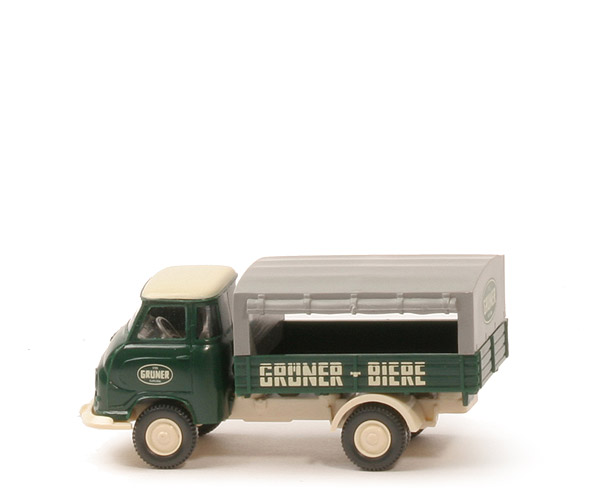 Sondermodell des MAV Franken: "25 Jahre Modell-Auto-Club Franken e.V.". Die Farbangabe "moosgrün" findet sich nicht der Farbkarte von Holger Wanner. Das Kabinendach ist hellelfenbein schabloniert. Mit 6 unzertrennten Flaschenkästen unbemalt moosgrün.