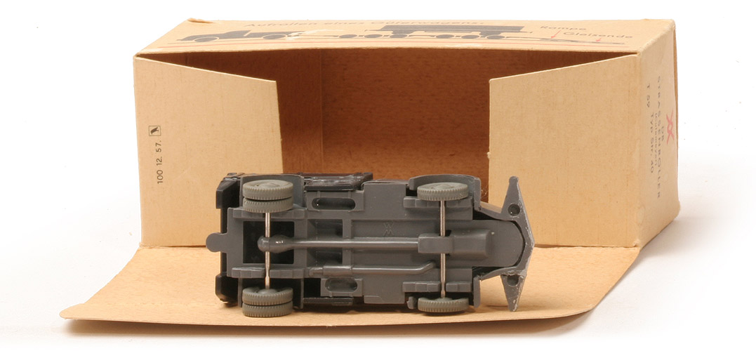 Dies ist die seltene letzte Version mit Bodenprägung WM ohne Kreis auf Höhe der Trittbretter (anfangs mit WM im Kreis unter dem Zughaken). Dazu passend die neueren Räder und der Karton mit WM ohne Kreis.