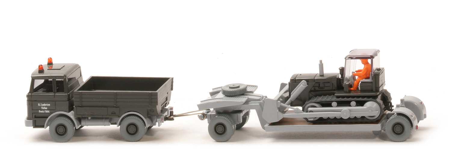 Türdruck Zugmaschine "N.C. Lambertsen - Tiefbau - Preetz/Holst.". Im Beipack gibt es zwei hohe Stapelkästen in silbergrau (BP neues WIKING-Logo und WM) und eine Tonne in rot und eine Tonne in maigrün. Die Farbangabe "olivbraun" gibt es nicht in der Farbkarte des Holger Wanner - dort: ca. helles (warmes) blassbraun.