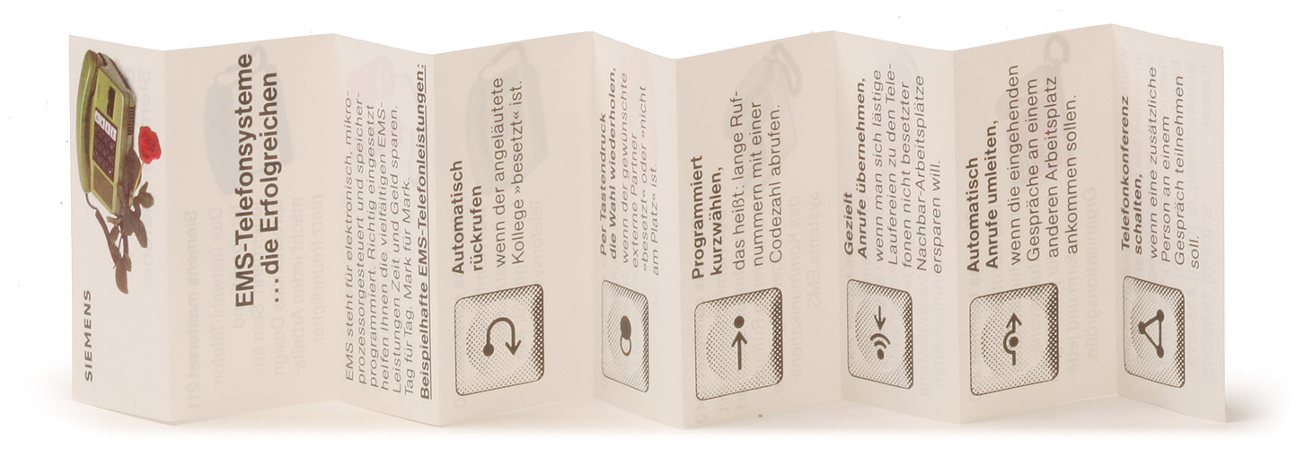 Werbemodell mit wunderbarer Leporello-Einlage mit 80er-Jahre-Telefonen.