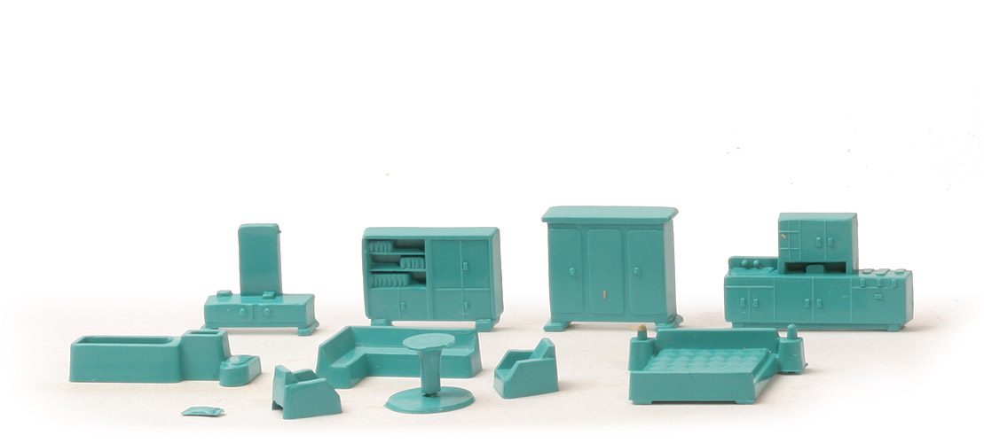 Die Möbel zum Landhaus umfassen Garderobe, Tischplatte mit Sockel, Couch, 2 Sessel, Kissen, Wohnzimmerschrank, Küchenzeile, Sanitäranlage, Doppelbett und Schlafzimmerschrank. Besonder- heit: der Tisch hier in Ausführung als Cocktailtisch mit kleiner Tischfläche und großer Sockelplatte. Die Farbangaben "verkehrsrot" und "blautürkis" finden sich nicht in der Farbkarte von Herrn Wanner.