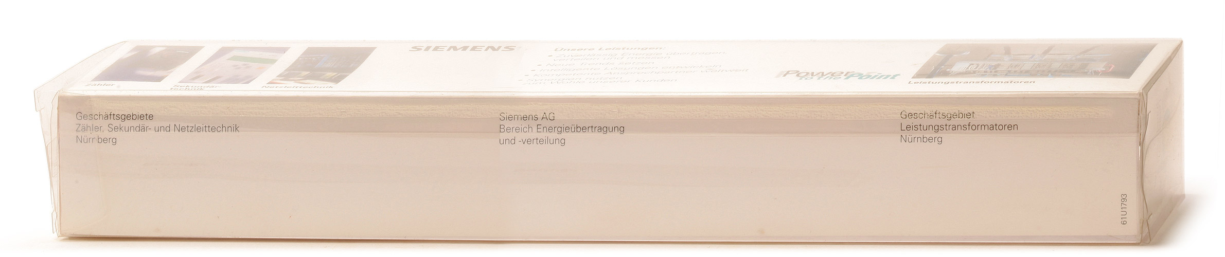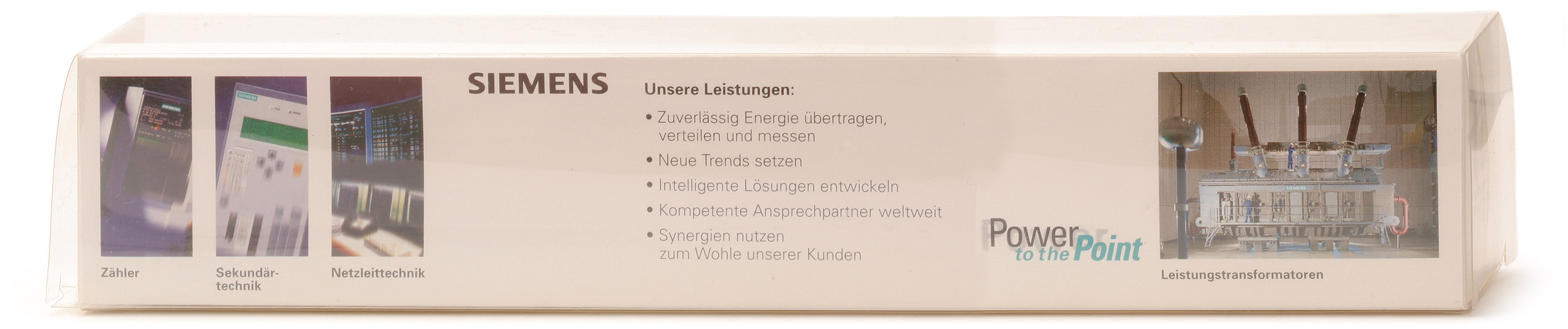 Während das Schwestermodell in eine kleine Box mit entsprechender Werbeeinlage gezwängt wurde, darf sich dieses Modell in voller Länge in der Werbeschachtel präsentieren. Innenseite mit Nürnberger Skyline, Rückseite mit "Power to the Point" Reklame (u.a. Foto von riesigem Trafo), Boden u.a. mit Kennziffer 61U793 und Laschen mit "top, Standort Nürnberg H." Zumal mit Werbeeinlage eher selten.