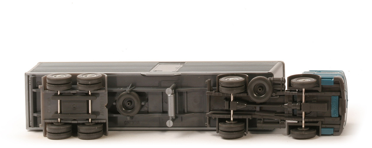 Dach und Türen lichtgrau, Chassis Zugmaschine, Aufliegerchassis basaltgrau, Achseinheit des Aufliegers staubgrau, Bolzen integriert. Sehr selten ist das Zugmaschinenchassis in anthrazit. An sich wäre ein Made in Germany - DAA zum frühen Zugmaschinenchassis passender. |