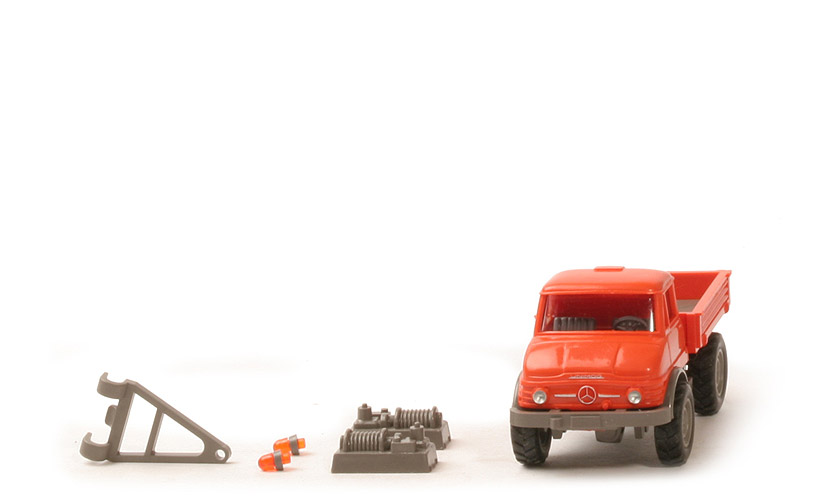 Viertes Modell aus dem "kleinen WIKING-Laden" von Michi Bloeßl. Als Zubehör beigefügt sind 2 Warn- lichter orangetransparent, 2 Sockel in ca. steingrau, 2 Seilwinden-Einheiten (z.B. siehe Erdbeweger) und eine Deichsel mit kleiner Kupplungsöse. Zur Montage der Warnlichter müsste man diese basal kürzen oder Löcher in das Dach des Unimogs bohren, da diese deutlich unten aus den Sockeln herausgucken.