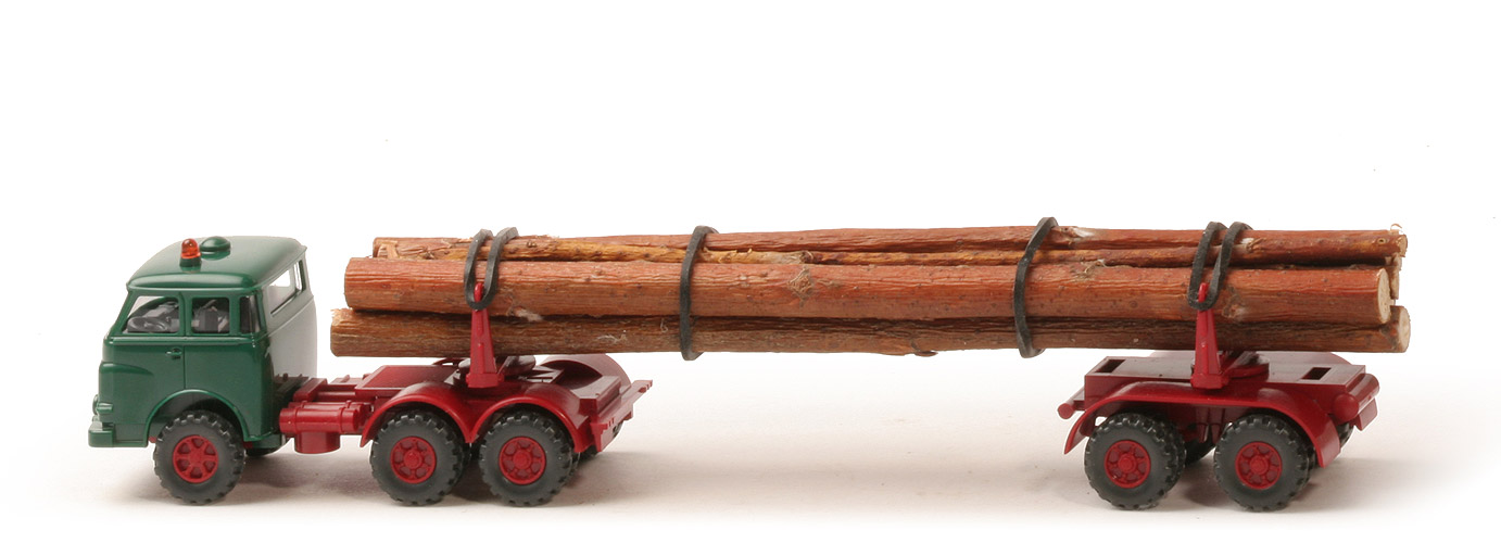 Dritte Edition aus dem "kleinen WIKING-Laden" von Michi Bloeßl. Früher gab es keinen 5-achsigen Langholztransporter. Sehr hübsches und innovatives Modell mit Echtholzbeladung. Offiziell ein MAN 15.215 DF (1966 - 1968).