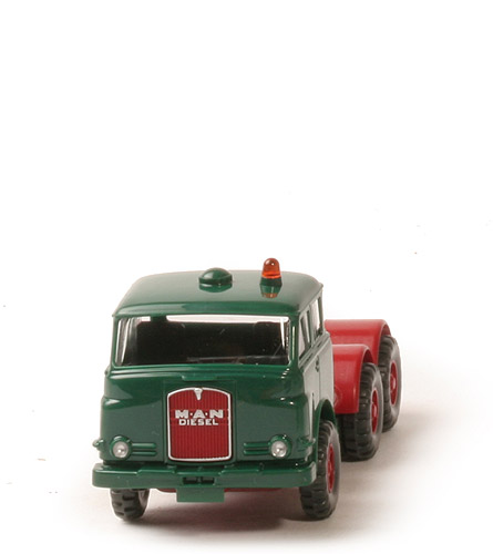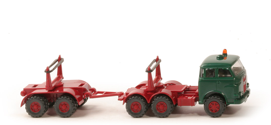 Dies ist die Pausbacke aus der Neuauflage. Typisches Unterscheidungsmerkmal zu den historischen Modellen bei der Pausbacke: Der Kühlergrill ist bei der Neuauflage unten fast gerade. Die Runge des Nachläufers ist fest verklebt, Die Runge vorne drehbar. Zugwagen und Nachläufer sind zunächst nur durch die Holzladung verbunden. Im Beipack gibt es einen Zughaken und eine Deichsel für den Nachläufer, mit der die Situation der Nichtbeladung nachgestellt werden kann (s. Bilder). Es gibt auch die Seilwinde im Beipack, die wir von den frühen Tiefladern oder dem US-Erdweger kennen (hier ca. rubinrot).