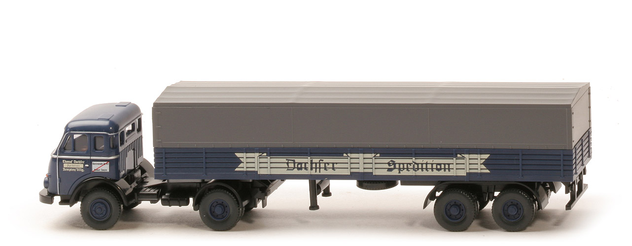 Sondermodell für Dachser, das in Restbeständen von Reinhardt Spielwaren vertrieben wurde (Nr. WIWFS54303700000). Erstmals gibt es hier das neue Fahrerhaus auf einem 2-Achs-Chassis. Sattelzüge aus der Zeit des Originals hatten eher noch keinen Unterfahrschutz. |
