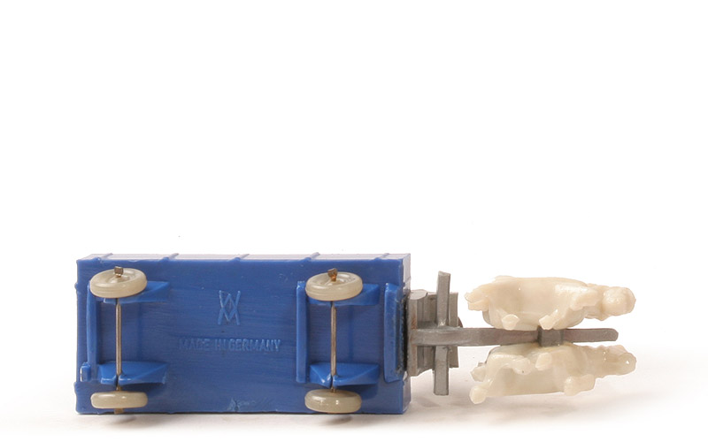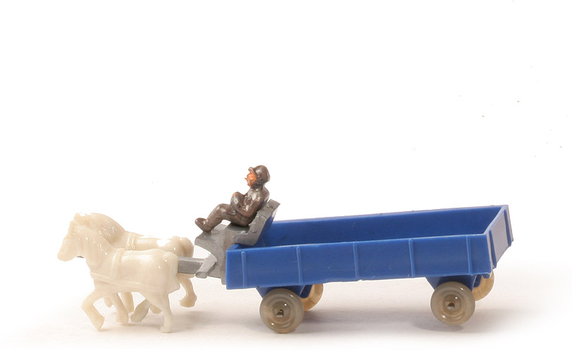 Der offenbar übergewichtige Kutscher destabilisiert hier die Lage des Gespanns. Hübsche schwarze Melierungen im blauen Kunststoff.