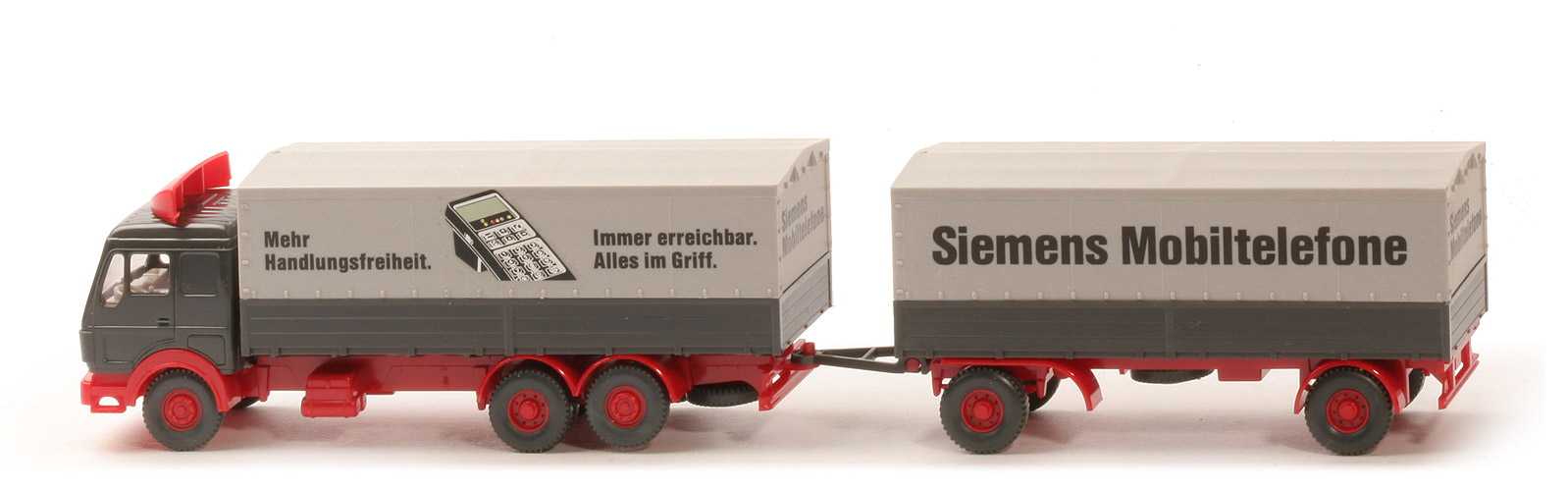 Das Modell gab es häufig noch ohne Abziehbild eines Mobiltelefons zwischen den beiden Schriftzügen auf der Plane des Zugwagens (GK Siemens 31).
