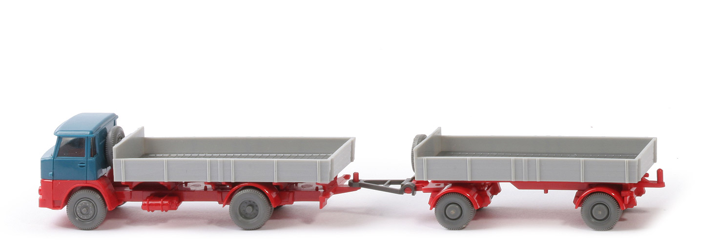Dies ist der seltene Anhänger mit der frühen flachen Henschel-Pritsche. Die Stirnwand ist erhöht. Die Pritschenseiten verjüngen sich nach unten in einer 4-fachen Abtreppung der Pritschenverbretterung. Mit diesen Rädern nicht im GK. |
