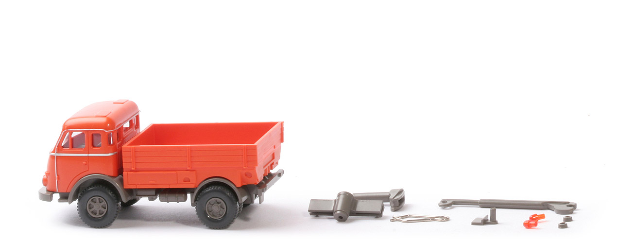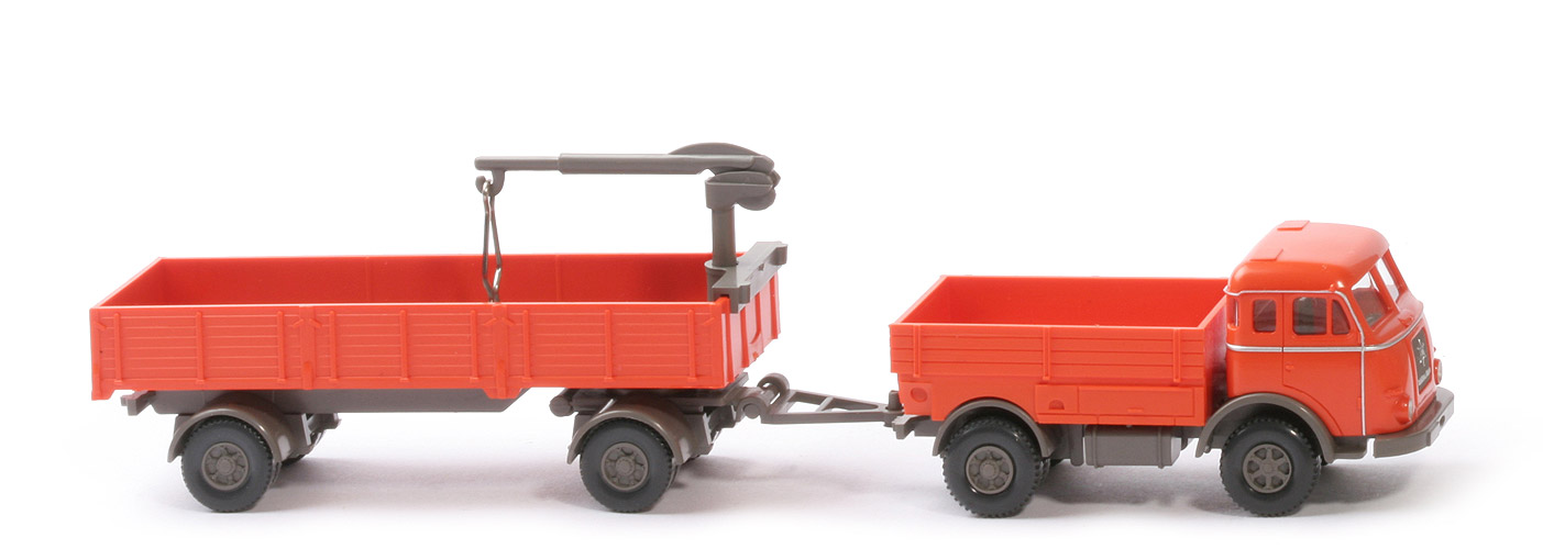 Ein Modell zum Kombinieren: Es kann in einer Reminiszenz an den Baustoffwagen als "kleiner" Sattelzug fahren, es ist allerdings auch der Einsatz als Anhängerzug möglich. Dazu sind eine Lastpritsche und ein Einachsaggregat für den Auflieger dabei, der dann als Anhänger imponiert.