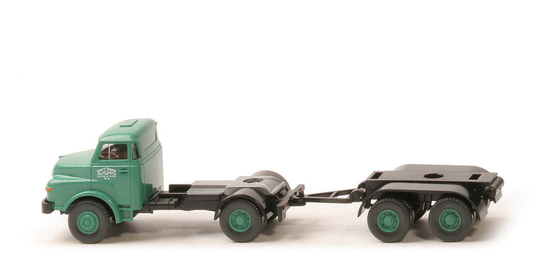Lechtoys Edition 44 in Podestschachtel "Solozugmaschine (MAN) "Schwarzbau"", Auflage 500. Dieses Modell verbreitert die Bandbreite der Kombinationsmöglichkeiten der Schwarzbau-Modelle. Die Türen tragen den Aufdruck des Schwarzbau-Logos.
