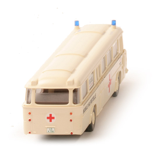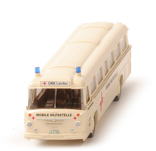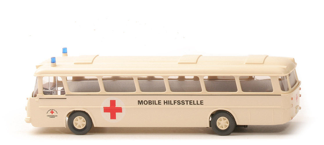 Lechtoys Edition 19 in Podestschachtel "Büssing Senator Bus Mobile Hilfsstelle Deutsches Rotes Kreuz". Auflage 500. Aufwändig bedrucktes Modell: vorne und an den Seiten "Mobile Hilfsstelle" und Rotkreuze, auf Fenster "Eingang - bitte vorne einsteigen", Logo "Deutsches Rotes Kreuz" und "Kreisverband Landau". Blinker orange, Kennzeichen etc. |