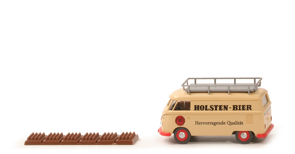 Collect & Invest (38): "In den 50er und 60er Jahren reichte der VW-Bulli für viele Bierverleger noch aus, um damit die Kunden zu beliefern. Auf dem Dach wurde dann das Leergut verstaut. Das Vorbild für unser Modell fanden wir in Kappeln an der Schlei im Norden Schleswig-Holsteins." Zugabe: 6 Getränkekästen am Spritzling in hellem Schokobraun.