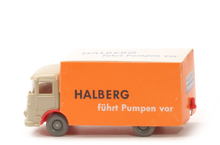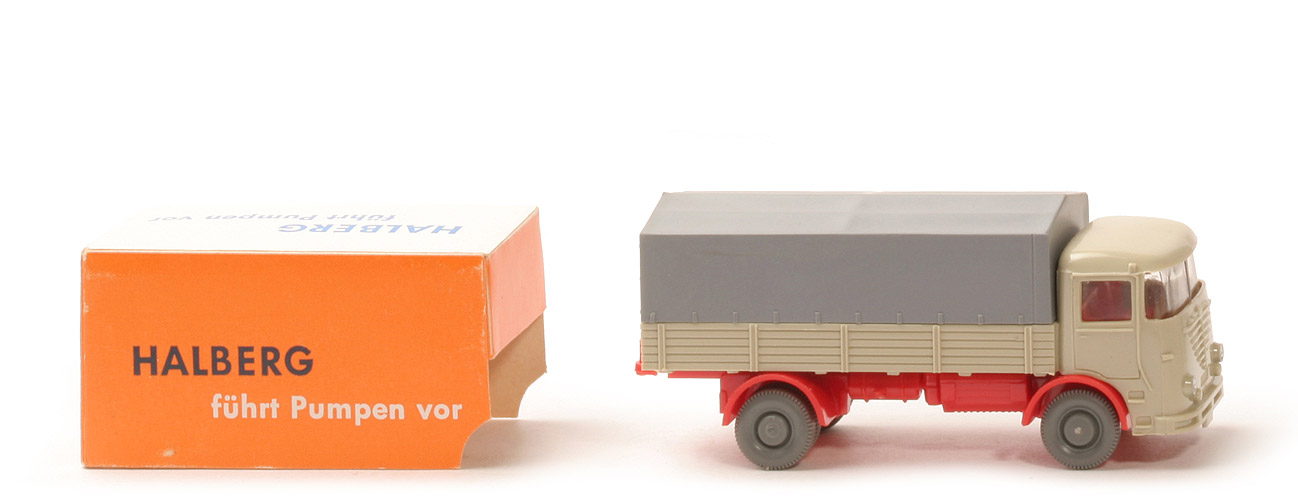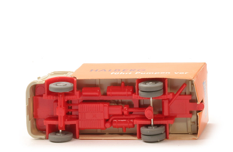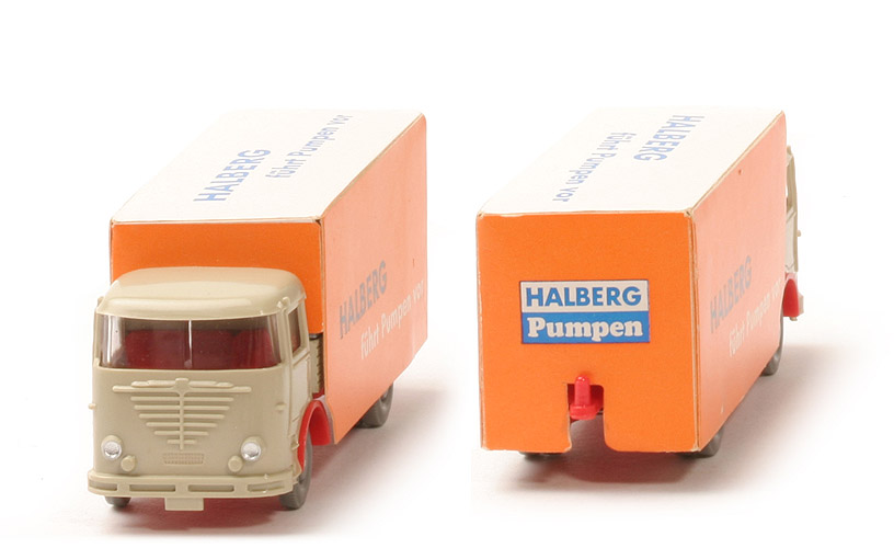 Halberg war ein Traditionsunternehmen, dessen Geschichte bis 1756 zurückging. Der Stamm- und Hauptsitz der Firma "Halberg Pumpen" war in Ludwigshafen (Link Wikipedia). Wir sehen hier ein besondere Art eines WIKING-Modells als Werbeträger: Auf das normale Serienmodell ist mit hoher Präzision ein Aufbau aus Pappe gearbeitet, der einfach über die Pritsche nebst Plane gestülpt wird. Die einseitig gestrichene Graupappe erinnert in der Haptik an die orange-weißen Originalkartons.