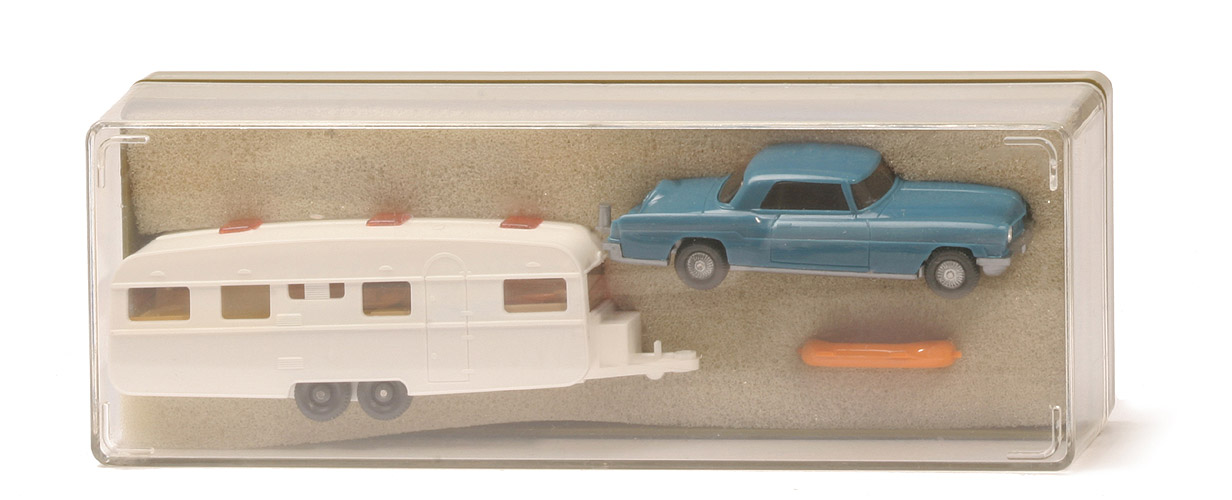 Ein Wohnwagengespann in Geschenkpackung in der letzten Version. Der Wohnwagen hat die späte Bodenprägung "92", der Grill des Zugwagens ist nicht mehr gesilbert und die Verglasung ruht auf den 3 Stützen. Die Box ist olivgrün.
