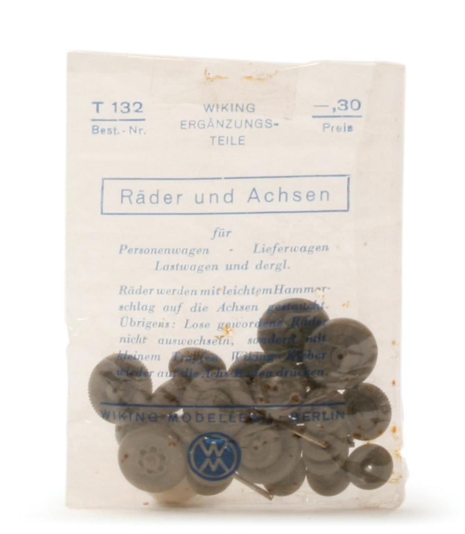 Bei Herrn Saure gelistet als "Kleine Räder und Achsen". Anfangs gab es nur eine Sortierung, wahrscheinlich wie hier große und kleine Räder gemischt. Mit der "T"-Nummer von 1954 bis 1957 im Programm. Text: