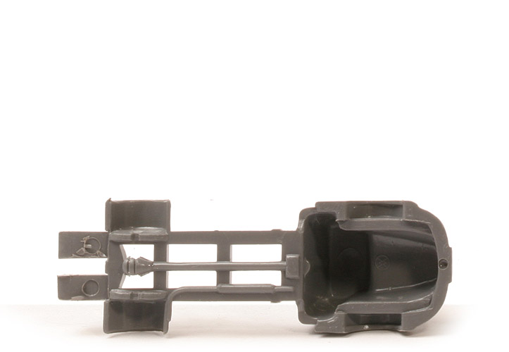 Hier mal eine unverklebte Fahrerhaus/Chassis-Kombination in basaltgrau. Nie verklebt. Interessant: innen eine sonst nicht sichtbare Bodenprägung in der Kabine: WM im Kreis. Mit Schlitz für Kippermechanik.