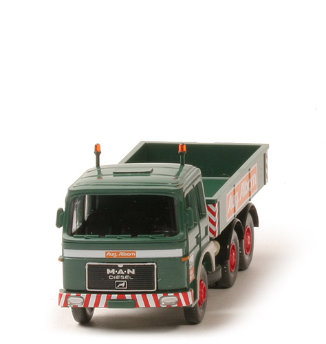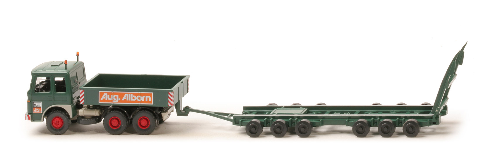 Modell zur Intermodellbau 19. - 22. April 2018. Weitere hübsche Bedruckung: An der Front ein weißer Balken mit "Aug. Alborn" als Negativ-Druck in orange, Stoßstange vorne mit Warnbaken rot/weiß, Türen mit Logo schwarz auf weiß und "Aug. Alborn" als Negativ-Druck in orange, Kotflügel perlweiß schabloniert.