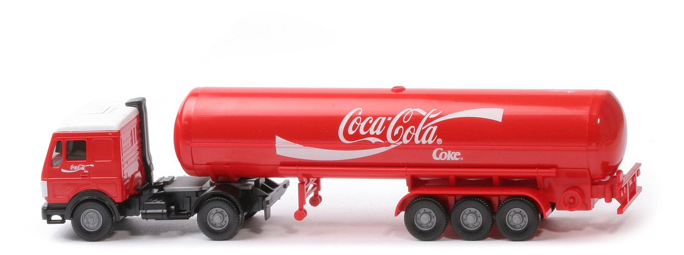 Teil einer Lemke-Collection-Packung. Dort gibt es noch einen Cola-Kesselwagen. Das Modell ist baugleich mit dem "Hoyer", nur dass der Auflieger das neue WIKING-Logo trägt. Das Fahrerhaus ist hübsch weiß schabloniert (mit "Cola" an der Front als Negativdruck) und trägt einen Türdruck mit Cola-Logo.