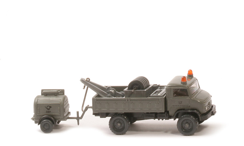 Teil der PMS-Packung "Edition 2001 - Kraftfahrzeuge der Deutschen Bundespost". Neuauflage mit neuem WIKING-Logo, dünnem Zughaken und mit Lenkrad. Im GK ist die Farbe unzutreffend als basaltgrau notiert. In der Packung zieht dieser Unimog einen gleichfarbigen Kompressor-Anhänger von Preiser.