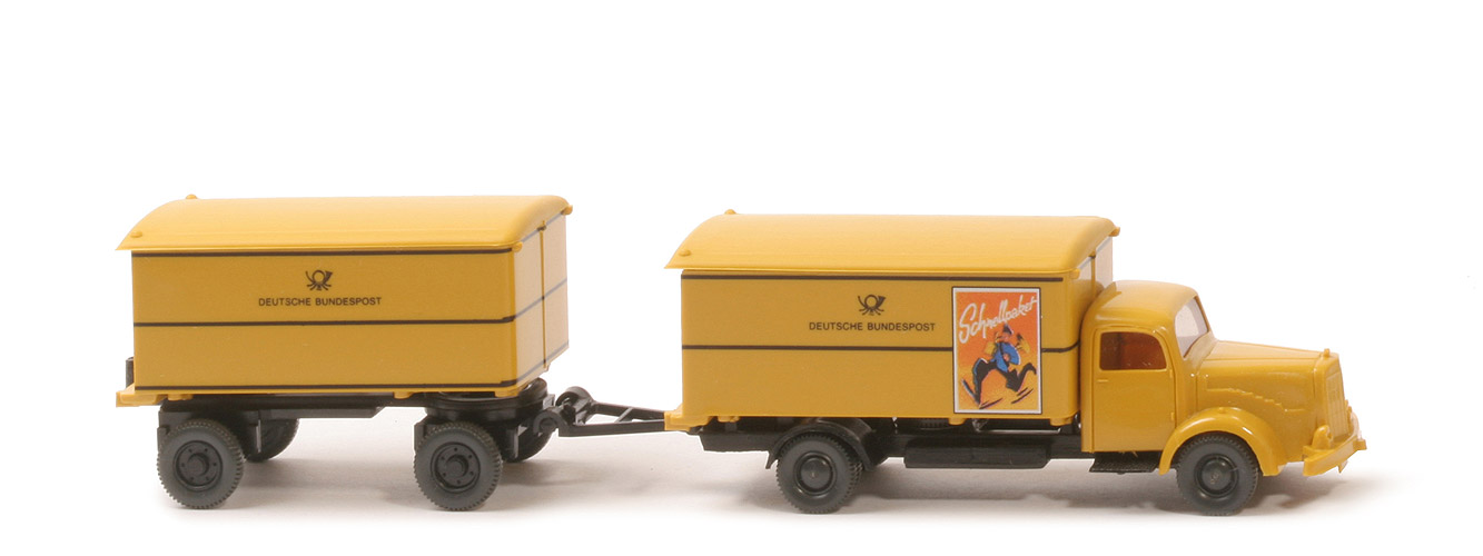 Teil der PMS-Packung "Höhepunkte der Postgeschichte - No. 2, 50 Jahre Schnellpaket der Deutschen Bundespost". Farbe auch als "altgelb" oder "honiggelb" bezeichnet. Das Modell sieht vorne ohne gesilberte Scheinwerfer ziemlich trist aus. In der Packung zieht das Modell einen passenden Kofferanhänger und zusätzlich einen Pritschen-Anhänger. Für den Altsammler bemerkenswert: Die verbauten Räder gibt es sonst nur in hellen Grautönen. |