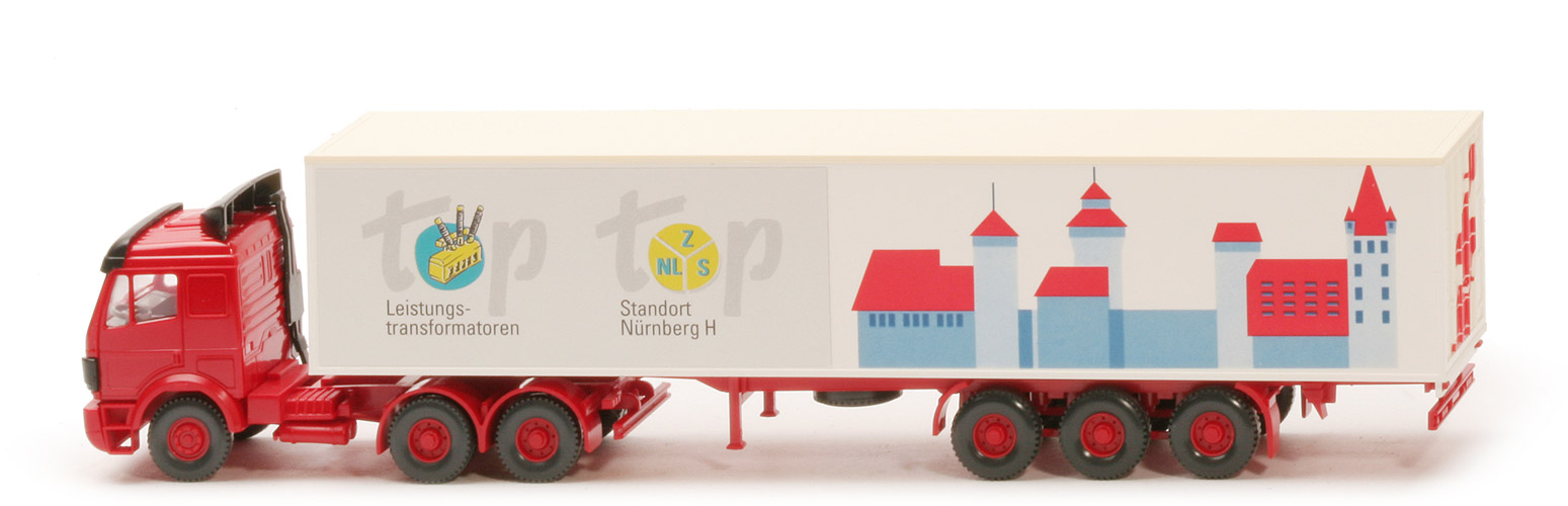 Mit Spoiler und Sonnenblende in schwarz. Der Spoiler hat einen Aufdruck "Siemens" in weiß. Die Hecktüren des Koffers sind mit einem aufstrebendem Pfeil bedruckt. Die "Häuser" stellen stilisiert - baulich in der richtigen Reihenfolge - die wichtigsten Gebäude der Nürnberger Kaiserburg-Anlage aus dem 11. Jahrhundert dar. |