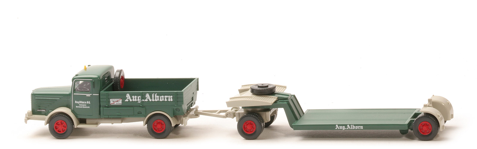Hübsches Modell zur Intermodellbau 15. - 19. April 2015. Büssing-Spinne gesilbert, Grill schwarz hinterlegt. Unten seitlich an der Motorhaube ein silberner Schriftzug "Büssing". Die Zugmaschine trägt seitlich den Druck "Aug.Alborn K-G. - Transporte Dortmund-Hombruch" und ein Standortschild "Güternahverkehr