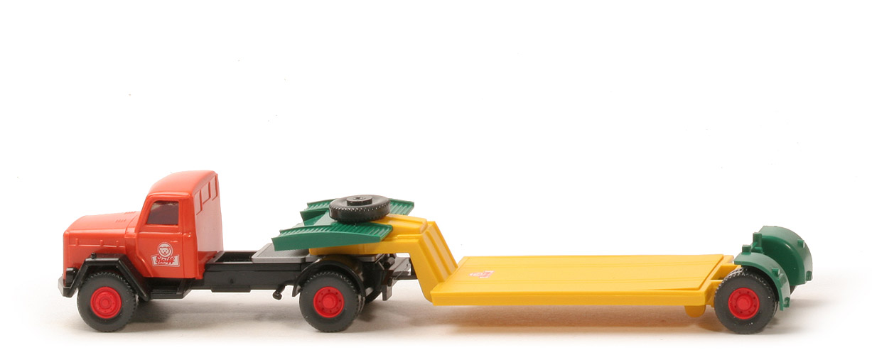 Durch neu entwickeltes Chassis für den Saturn möglich gewordener Sattelzug. Modell mit sehr spielzeughafter bunter Anmutung.