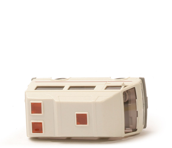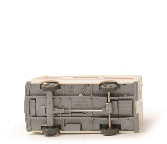 Messemodell mit Aufdruck wie in der Messeinfo 1980 abgebildet. Nur Streifen - ohne "Sven Hedin"- Emblem. Chassis silbern mit Bodenprägung 300 302 ... (Serie: VW-LT 28 ...). Die Oberlichter sind orange transparent (Serie: milchig transparent). Unscheinbare Rarität! Die Inneneinrichtung ist aus Einzelteilen zusammengefügt, u.a. aus einer Pritscheneinlage (Unimog?).