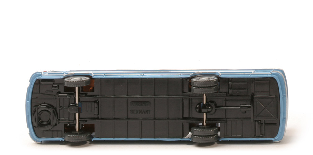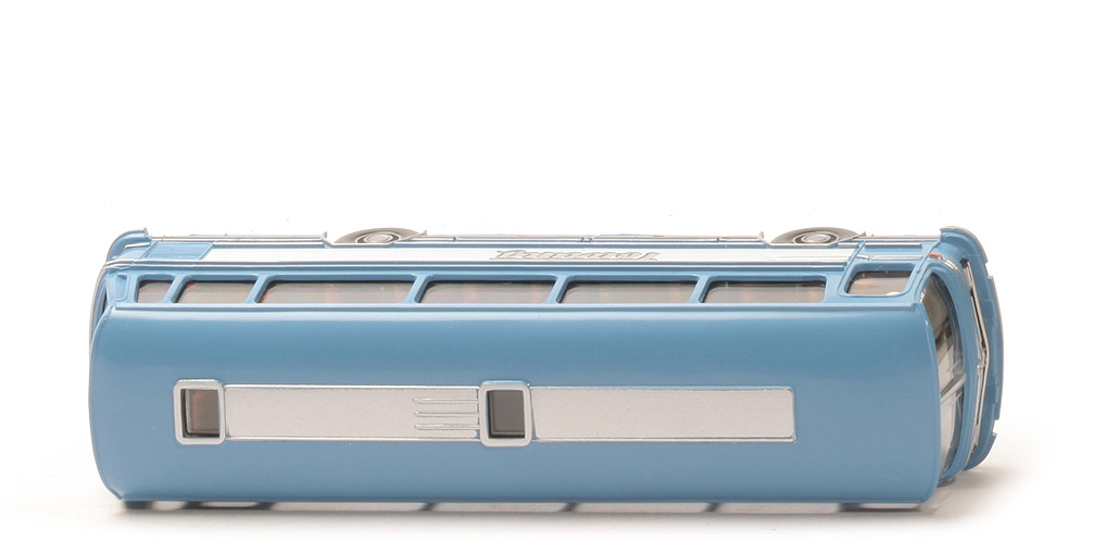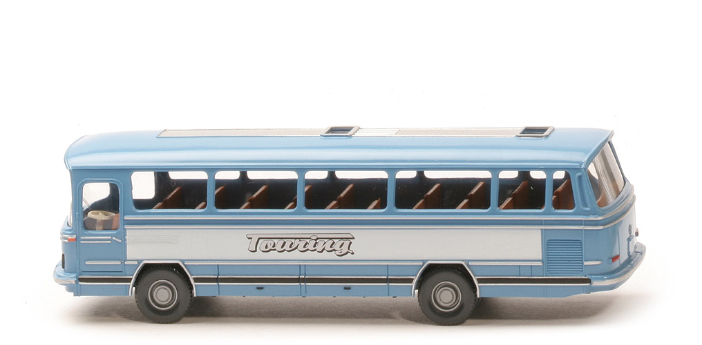 Hübsches Serienmodell - sehr liebevoll bedruckt. Gesilbert sind z.B. Zierlinien, Türgriffe, Mittel- strebe Frontscheibe, Scheibenwischer, Mercedes-Sterne etc. Blinker vorne orange, Rückleuchten rot. Seitlich unten schwarz abgesetzt. Druck "Touring" silbern/schwarz auf weißer Fläche.