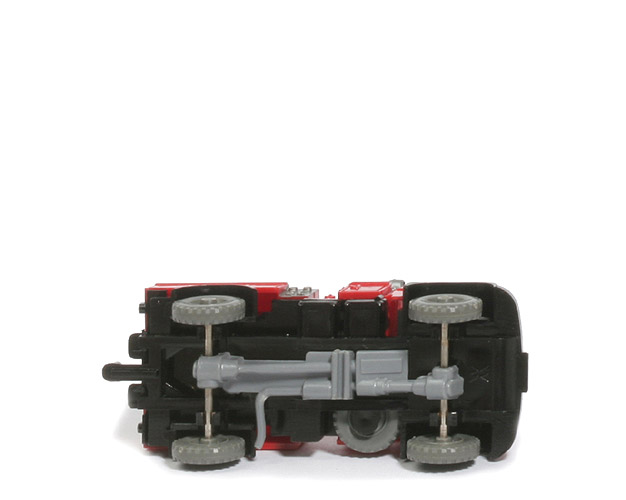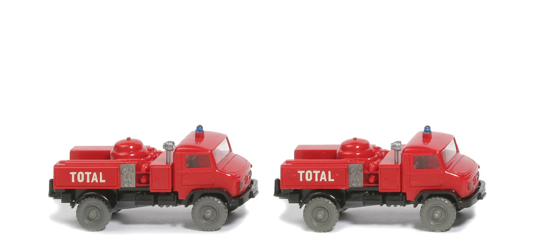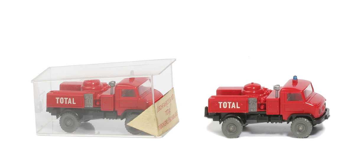 Originalverpackung: nach einer Seite offene, konische klare Kunststoffbox, die nur mit einer Banderole verschlossen wurde. Text auf der Banderole: "Löschfahrzeuge mit Total Trockenlöschanlage". Fotos unten mit dem Pendant mit Griffen. |