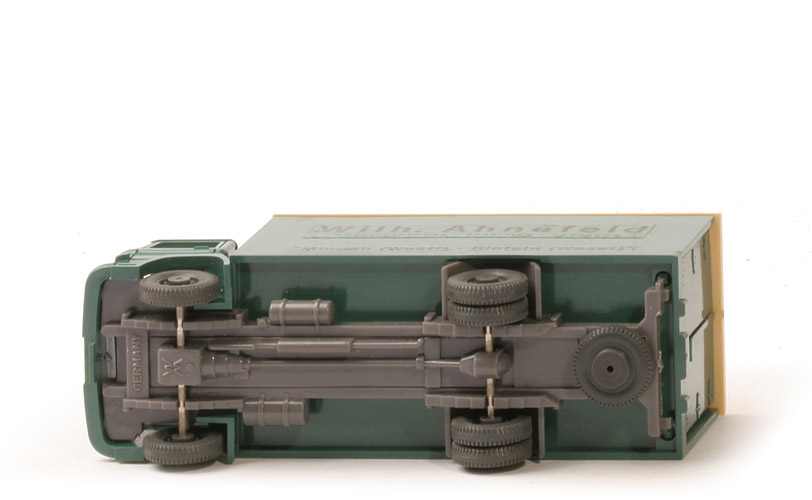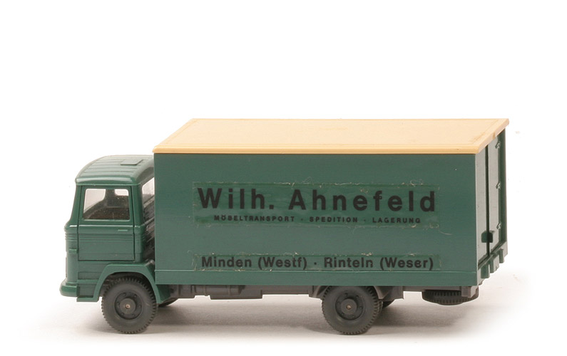 Schon als Grundmodell in dieser Farbe ist dies ein seltenes Ding. Der hohe Koffer in patinagrün ist sonst bekannt als Werbemodell für Mercedes und als Werbemodell "Inertol". Hier nun mit genau den Folienaufklebern des extrem seltenen Ahnefeld-Zuges MB 312. Ein rätselhaftes Modell. Jenen Möbelzug 312 gab es ca. 1968. Der hohe Koffer taucht jedoch erst 1975 auf. Bemusterung mit noch vorhandenen Folien-Aufklebern? Andererseits hatten die Vorgänger-Werbemodelle des 1317 Ahnefeld mit flachem Koffer bereits einen Druck.