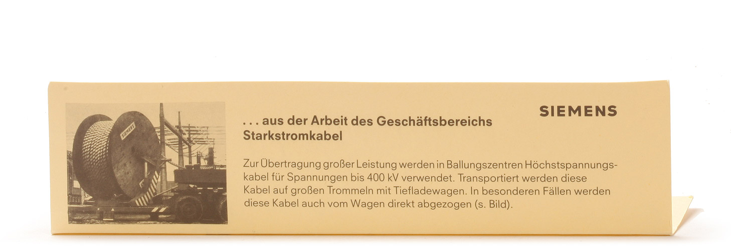 Siemens Werbemodell. Die Werbeeinlage hat die Grundfarbe nach Wanner-Karte kräftiges ~creme. Dem Boden zugewandt zeigt sich auf der Pappe die Ziffernfolge "611295".