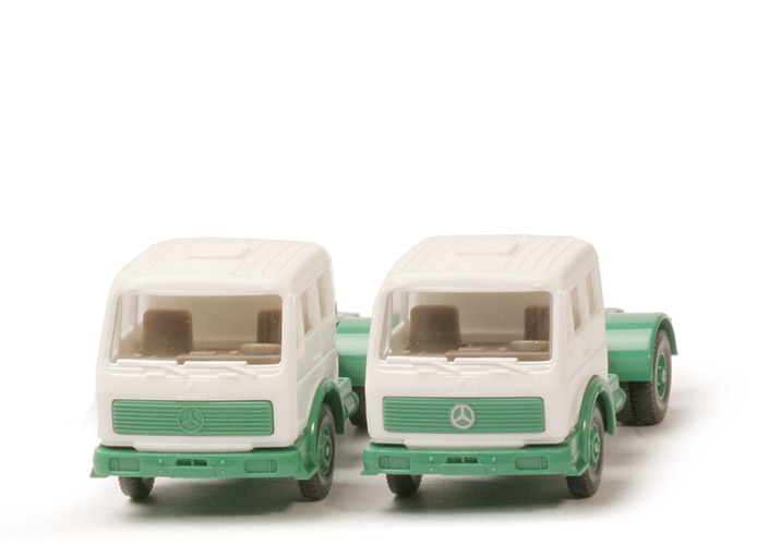 Das Besondere: Der Grill hat einen reliefierten gravierten Mercedes-Stern. Das Serienmodell trägt einen silbern gedruckten Stern auf planer kreisrunder Fläche. Solcherlei Grills sind sonst überhaupt nirgends verbaut worden. Auflieger mit stirnseitigem Kühlaggregat.