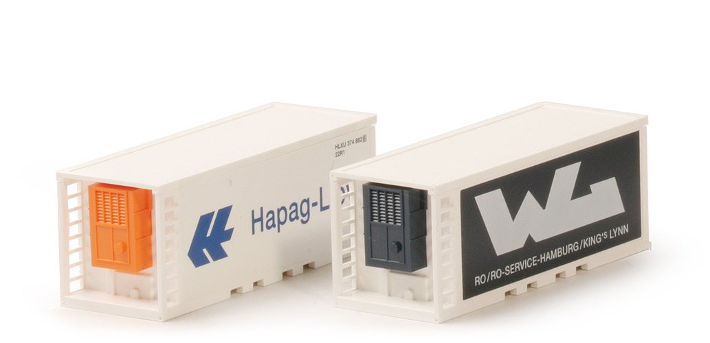 Hübsches Modell in Anknüpfung an WIKING-Modelle aus den Siebzigern. "WL" gab es als einzelnen Werbe-Container (Plywood) mit Papieraufklebern, "Hapag" nie offiziell als Kühlcontainer. Nett: Kühlaggregate jeweils in stahlblau und rotorange. Bei den historischen Modellen gab es keinen Krupp mit Containern.
