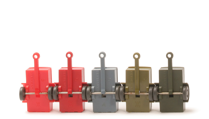 Ausschnitt aus der /6er Reihe: Orangerot - rot - graublau - hellgelbolivgrün - flaschengrün.