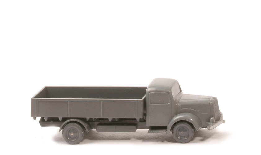 Achsen | Rollachser | Farbe Kabine u. Chassis | basaltgrau | Verstärkung Trittbretter | mit | Bemalung Kabine | Scheinwerfer, Stoßstange | Version Chassis | Version 1b | Chassis Farbe | dunkelbasaltgrau | Bodenprägung | WM im Kreis | Pritsche | Seiten glatt | Farbe Pritsche | dunkelbasaltgrau | Zughaken | nach unten | Zapfen | Flachzapfen | Kennzeichen | bemalt silbern | Befestigung Pritsche | geklebt | Räder | 10mm, mit Profil | Räder Farbe | dunkelbasaltgrau |