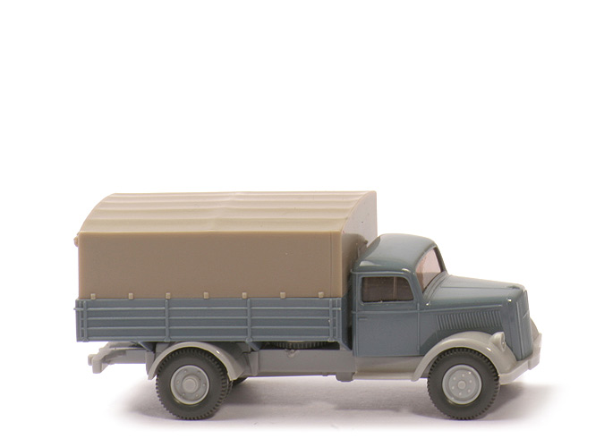 Kabine | graublau | Verglasung | getönt | Blitz auf Grill | mit | Chassis Farbe | lichtgrau | Chassis Bodenprägung | WM | Zughaken | ohne | Chassis hinten | geschlossen | Reserverad | unter Pritsche mittig | Pritsche | graublau | Pritsche Bodenprägung | 3350, WIKING Germany | Pritscheneinlage | silbern | Bemalung | ohne | Räder | 11mm, Profil fein | Felgen | lichtgrau eingesetzt | Plane | ca. braunelfenbein |