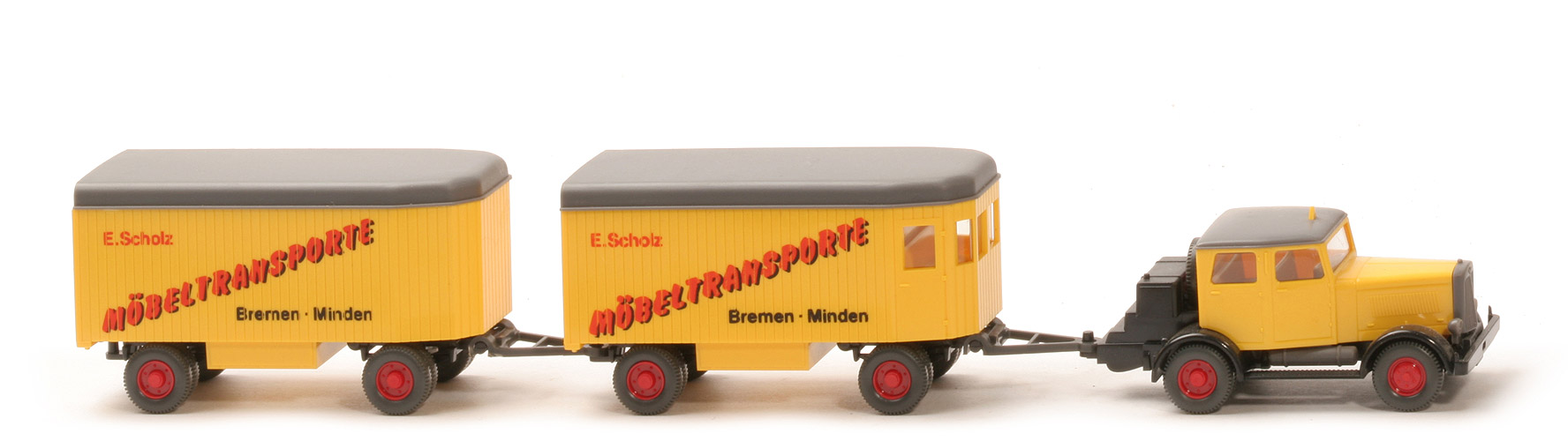 | Zugmaschine | Kabine Farbe | gelb | Grill | basaltgrau, eingesetzt | Dach | basaltgrau | Warndreieck | gelb | Inneneinrichtung | ca. graubeige | Lenkrad | integriert | Chassis | schwarz | Bodenprägung | WIKING Berlin-W | Druckluftbehälter | basaltgrau | Werkzeugkasten | schwarz | Reserverad | hinter Kabine | Räder | 11 mm | Felgen | rot eingesetzt | | Anhänger 1 | Aufbau | gelb, vorne mit Türen und Fenstern | Dach | basaltgrau | Chassis | schwarz | Werkzeugkasten | gelb, BP WIKING Berlin-W | Drehschemel | schwarz | Befestigung Drehschemel | Weichzapfen | Deichsel | Kunststoff, anthrazit | Beschriftung | E. Scholz ... (s.Foto) | Räder | 11 mm | Felgen | rot eingestzt | | Anhänger 2 | Aufbau | gelb, vorne ohne Türen und Fenstern | Verglasung | klar | weitere Anhänger-Details | wie Anhänger |