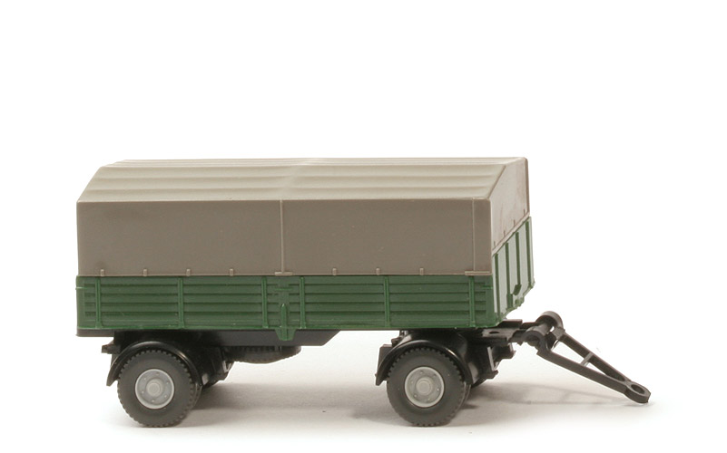 | Pritsche | Typ | hoch, Stirnwand erhöht, Unterseite glatt | Farbe | laubgrün | Pritscheneinlage | silbern | | Chassis | Typ | Basis geschlossen | Farbe | schwarz | Bodenprägung | WIKING, Made in Germany, 40 g | Zughaken | integriert | Drehschemel | schwarz | Radlauf vorne | Typ 3, schwarz | Radlauf hinten | Typ 3, schwarz | Nummernschild | an der Rücklichtstange des Chassis | | Plane | Typ | hinten offen, gerafft | Unterversion | mit Mittelsteg, Stecklaschen: hinten 2, vorne durchgehend | Prägung | WM, Nestkennung 3 Punkte | Farbe | steingrau | | weitere Details | Reserverad | unter Chassis (12 mm, Felge silbergrau) | Deichsel | angesteckt, Kunststoff | Bemalung Nummernschild | ohne | Bemalung Rückleuchten | ohne | Räder Typ | 12 mm, Profil grob | Felgen | silbergrau, eingesetzt |