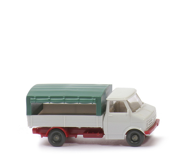 Kabine | hellgrauweiß | Verglasung | klar | Bemalung Scheinwerfer | ohne | Inneneinrichtung | ca. graubeige, Lkr integriert | Bemalung Kennzeichen | ohne | Chassis | ca. weinrot | Bodenprägung | WIKING, Berlin-W | Pritsche | hellgrauweiß | Rückleuchten | nicht bemalt | Plane | patinagrün | Räder | 9 mm, glatt, anthrazit |
