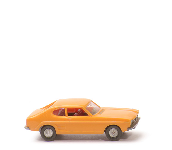 Farbe | dunkles glasiges melonengelb | Außenspiegel | ohne | Verglasung | klar, Türfenster offen | Inneneinrichtung | ca. weinrot | Lenkrad | separat eingesetzt, ca. hellelfenbein | Grill | Teil des Chassis | Chassis | silbern | Bodenprägung | Ford Capri WIKING Germany | Bemalung | ohne | Räder Typ | Riffelkappe anthrazit | Felgen | gesilbert |