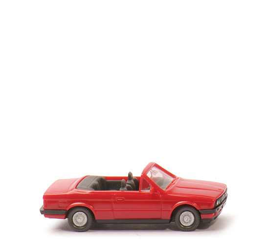 Farbe | rot | Außenspiegel | beidseits | Frontscheibe | klar | Inneneinrichtung | ca. basaltgrau, Typ Cabrio | Lenkrad | integriert | Grill | separat eingesetzt, schwarz | Stoßstangen | schwarz | Chassis | schwarz | Bodenprägung | WIKING, BMW 325i, Berlin-W, Germany | Bemalung | Scheinwerfer, BMW-Niere silbern | Räder Typ | Riffelkappe anthrazit | Felgen | gesilbert |