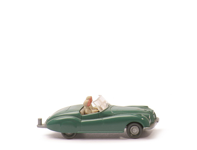 Windschutzscheibe | gerundet, Spritzteil | Farbe Karosserie | patinagrün | Grill | 6 Streben (Grill fein) | Trittbretter | mit | hintere Stoßstange | Teil des Chassis | Lenkrad | separat eingesetzt, 3-speichig | Sitze | separat eingesetzt, ca. graubeige | Figuren Farbe | ca. hellelfenbein | Bemalung Figuren | Gesichter | Chassisfarbe | silbern | Achshalterung | offen | Bodenprägung | Jaguar-Sport, WIKING Germany, 20 | Schlepploch | ohne | Zughaken | integriert, dreieckig, offen | Bemalung vorn | Scheinwerfer silbern | Bemalung hinten | ohne | Räder Farbe | anthrazit | Räder Typ | Riffelkappe, gesilbert |